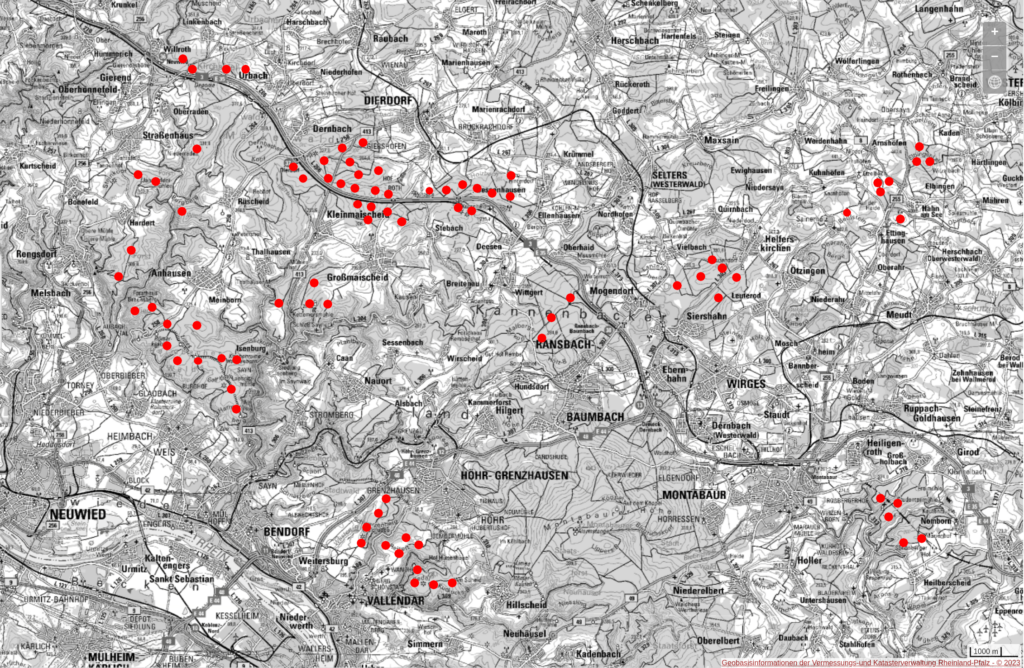 Jeder rote Punkt in dieser Karte ist ein geplanter Standort für eine 250-300 Meter hohe Windindustrieanlage! Im Umkreis von etwa 30 Kilometern werden wir in den nächsten 4-5 Jahren von über 60 Anlagen in Eifelturm-Höhe umzingelt werden!