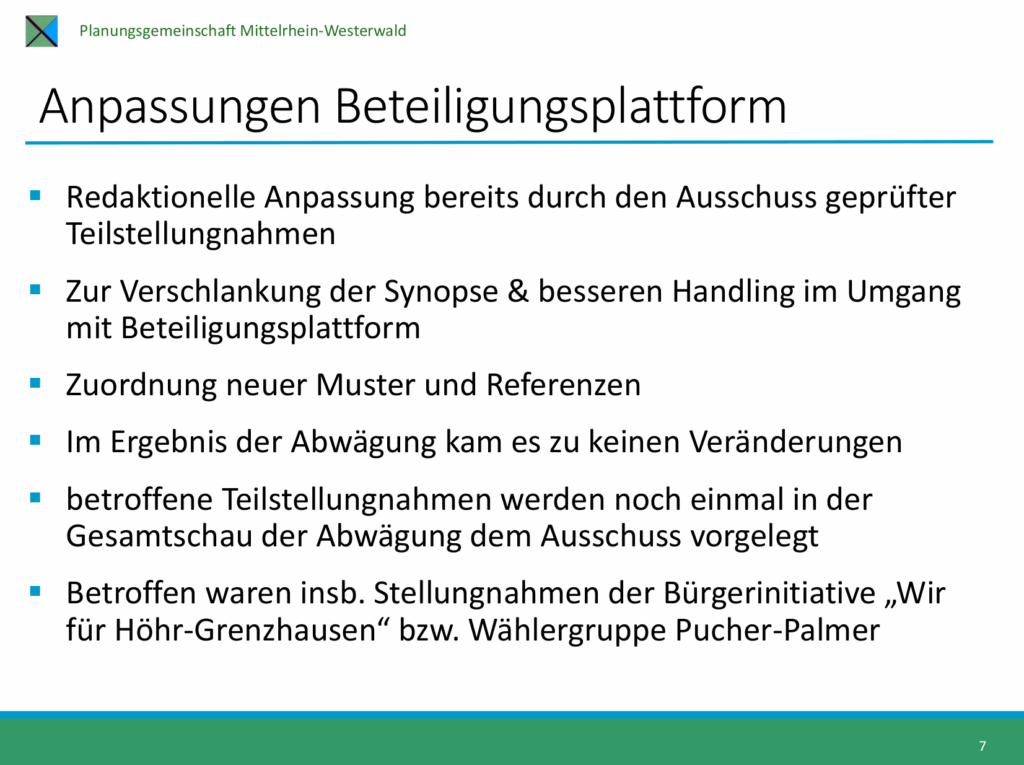 Am 16. September 2025 fand die 4. Ausschußsitzung der Planungsgemeinschaft Mittelrhein-Westerwald zur 1. Teilfortschreibung des Regionalen Raumordnungsplans 2017 statt. Hierbei geht es im Rahmen der politischen Zielvorgaben darum, sogenannte Windvorrangflächen für den weiteren Windkraftausbau festzulegen – ein Grund für die WG Pucher-Palmer den Prozess aufmerksam zu verfolgen.