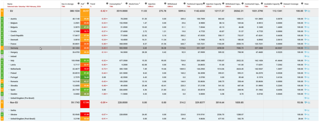 Deutschland importierte 2025 rund 1.000 Terawattstunden Gas – aus vielen Richtungen, aber keine davon wirklich stabil oder günstig. Die wichtigsten Quellen: Norwegen (44%), die Niederlande (24%) und Belgien (21%). Von den deutschen LNG-Terminals kommen lediglich 10%, davon stammen 96% aus den USA. Gleichzeitig exportiert Deutschland rund 220 Terawattstunden weiter in die Nachbarländer. Deutschland ist längst eine Durchleitstation im europäischen Gasnetz geworden. Das Problem: Gas fließt nicht nach Nationalitäten, sondern nach Druck, Nachfrage und Preis. Steigt die Nachfrage in einem Nachbarland, steigen auch hier die Preise. Die nationale Steuerbarkeit sinkt dramatisch. Die deutschen Gasspeicher gelten als Sicherheitsanker – sind es aber nur eingeschränkt. Sie gehören nicht dem Staat, sondern unterschiedlichen Marktakteuren und werden nach ökonomischen Regeln bewirtschaftet. Gas wird eingespeichert, wenn es günstig ist, und ausgespeichert, wenn der Preis steigt. Derzeit sind die Speicherstände auf unter 25% gefallen. Die Bundesnetzagentur erklärt zwar, es gäbe keine Mangellage. Technisch mag das korrekt sein – die Pipelines liefern, LNG wird angelandet. Ökonomisch jedoch steigt die Spannung: Je leerer die Speicher, desto stärker muss jede zusätzliche Nachfrage unmittelbar am Markt gedeckt werden, zum jeweils aktuellen Preis. Hinzu kommt, dass die Entnahmerate mit sinkenden Druck ebenfalls signifikant abnimmt. Anforderungsspitzen kann so nur schwer begegnet werden.