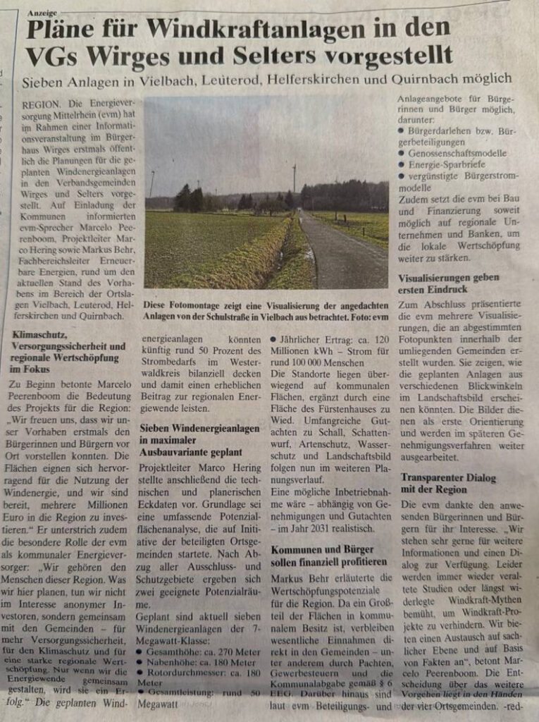 Der Artikel ist als „Anzeige“ gekennzeichnet – das steht klein oben links. Es handelt sich also um bezahlte Werbung der evm, nicht um redaktionellen Journalismus. Alle Zahlen stammen vom Projektierer selbst, wurden nicht unabhängig geprüft, und sind naturgemäß im günstigsten Licht dargestellt.
