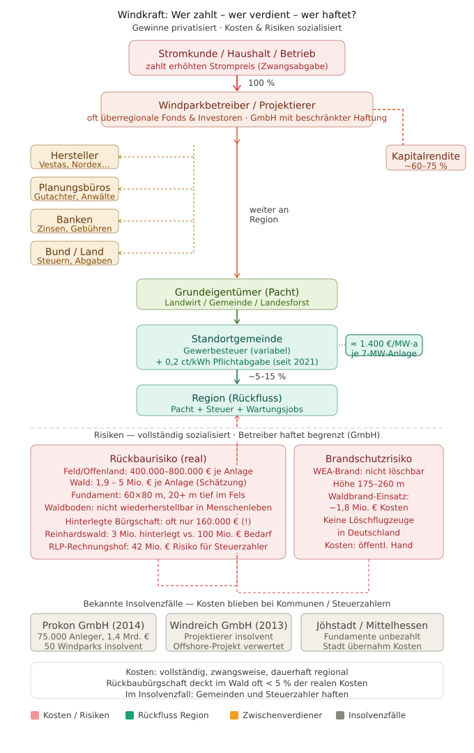 Zur starken regionalen Wertschöpfung: Die 0,2 ct/kWh-Pflichtabgabe an Standortgemeinden (seit 2021) entspricht bei einer 7-MW-Anlage mit ~2.000 Volllaststunden etwa 2.800 €/Jahr. Ansonsten zahlt der Stromkunde über den steigenden Strompreis (= quasi Zwangsabgabe/Steuerhöhung), nur ~5-15% fließen zurück in die Region.