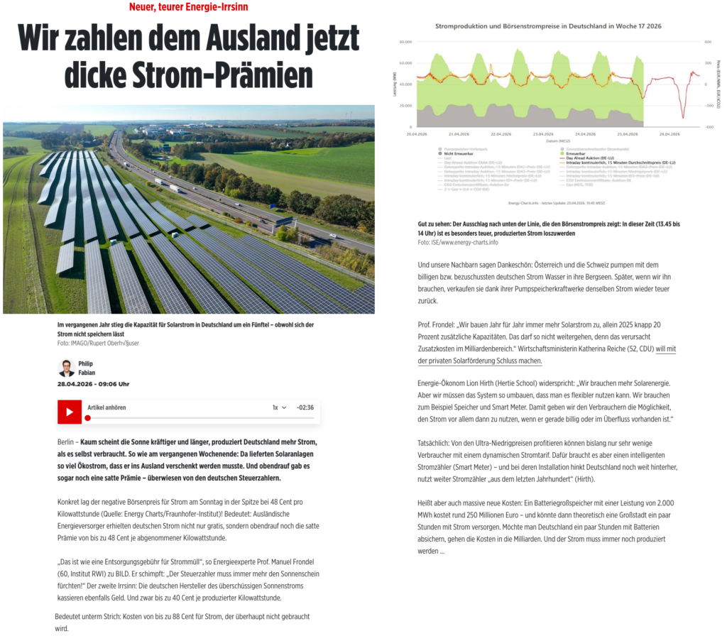 Deutschland produziert fröhlich am Bedarf vorbei, was zu immensen Kosten bei der „Stromentsorgung“ führt. Nur mathematisch Minderbegabte mit zu viel Geld auf dem Konto fordern noch mehr Zubau – und damit noch höhere Kosten.
