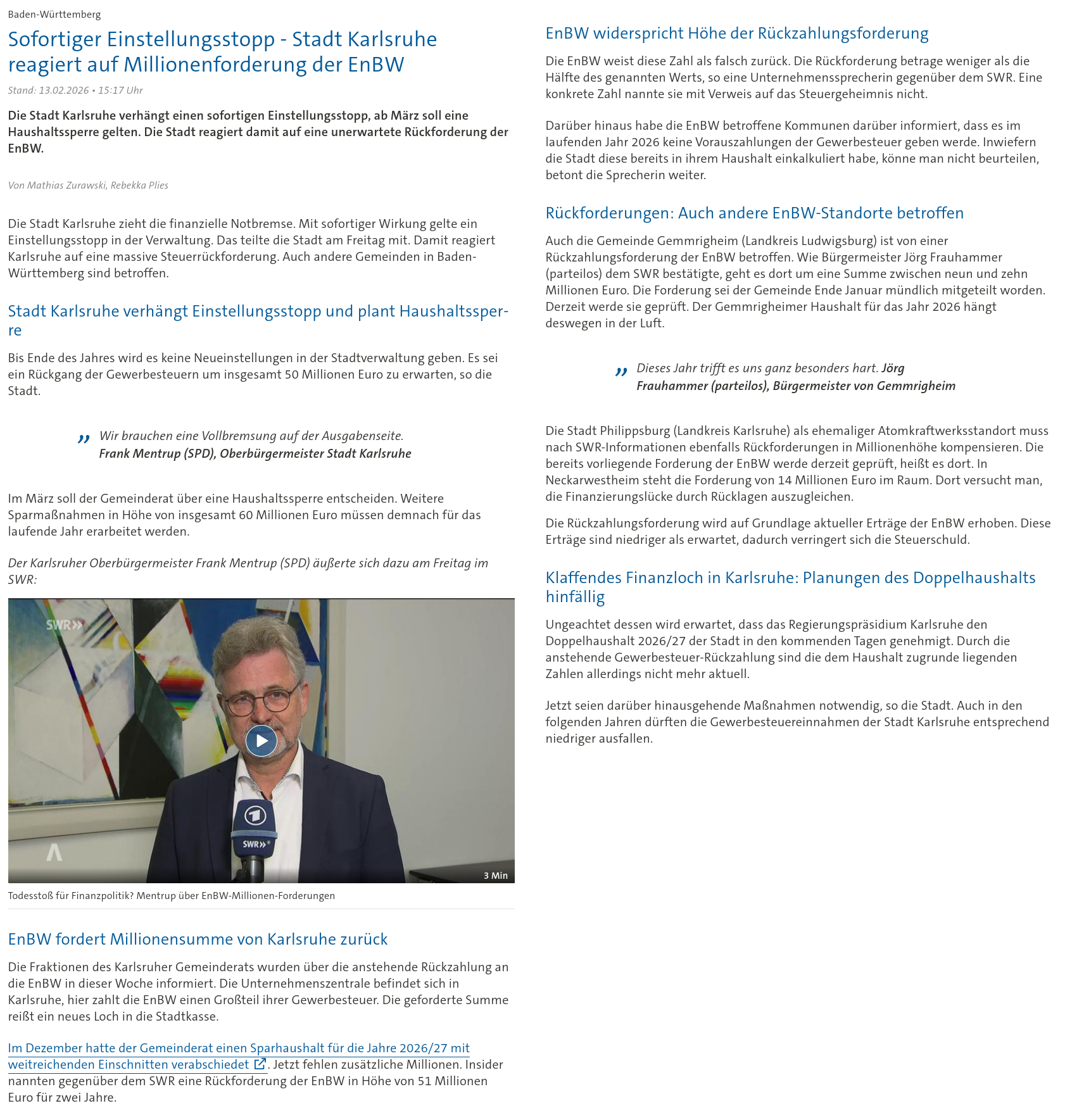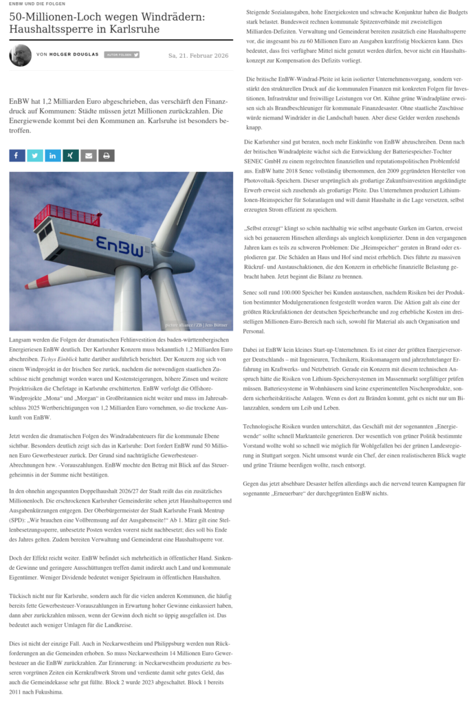 Da Windindustrie ohne Subventionen unwirtschaftlich ist – noch unwirtschaftlicher bei Offshore Anlagen – mußte die EnBW 1,2 Milliarden Euro abschreiben. Nun fordert die EnBW Gewerbesteuern in zweistelliger Millionenhöhe von Städten und Kommunen zurück. Besonders hart trifft es Karlsruhe, aber auch die Landkreise und damit kleineren Kommunen sind betroffen, da Umlagegelder fehlen. Chapeau, wie die Tagesschau es schafft, im Bericht ausführlich über die EnBW verursachte Finanzkrise zu berichten, ohne die Offshore-Windprojekt Pleite mit einer Silbe zu erwähnen.