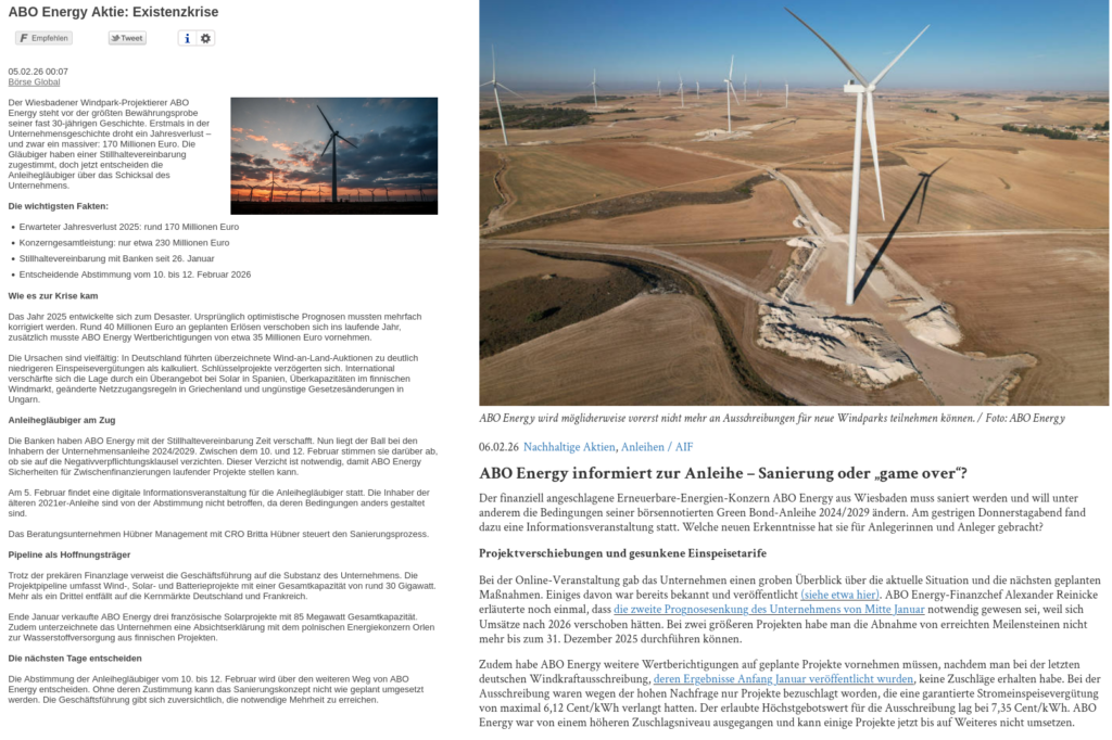 Der Projektierer ABO Energy des Windindustrieprojekts „Dierdorf Märkerwald“ befindet sich in einer Existenzkrise. Im November 2025 bekam die ABO Energy keine Zuschläge für ihre Projekte, in der Ausschreibungsrunde vom 1.Februar 2026 insgesamt (nur) 6 in Hessen, Nordrhein-Westfalen und Baden-Württemberg.