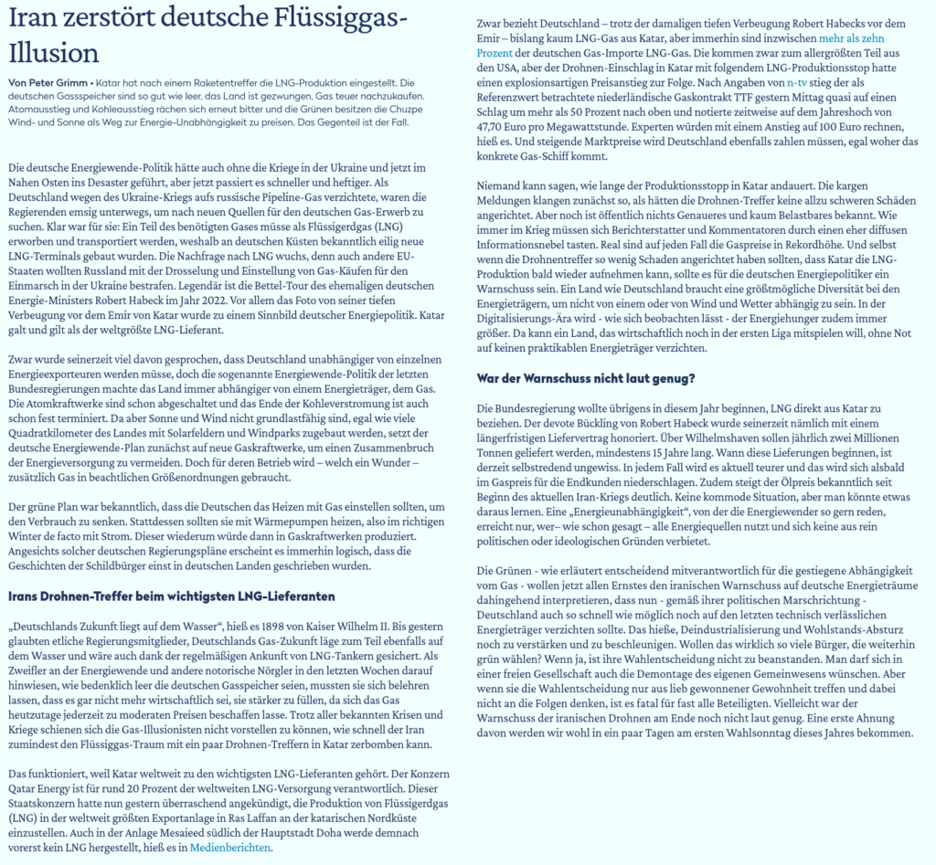 Nachdem man von Putin kein Gas kaufen möchte, weil…, die für 2026 geplanten LNG Lieferungen aus Qatar gerade ungewiß sind, weil man dort gerade die Produktion vorübergehend eingestellt hat, ist Deutschland nun – hurra – auf LNG-Importe aus den USA nahezu vollständig angewiesen. Und Trump kann man auch nicht leiden, weil…
