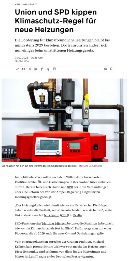 Immobilienbesitzer dürfen weiterhin Öl- und Gasheizungen einbauen. Unionsfraktionschef Jens Spahn kommentierte, der Heizungskeller werde damit wieder zur Privatsache. Allerdings müssen Lieferanten von Erdgas und Heizöl ab 2028 eine Grüngasquote erfüllen, die bei bis zu einem Prozent startet und schrittweise steigen soll. Die Förderung für klimafreundliche Heizungen soll bis mindestens 2029 bestehen bleiben.