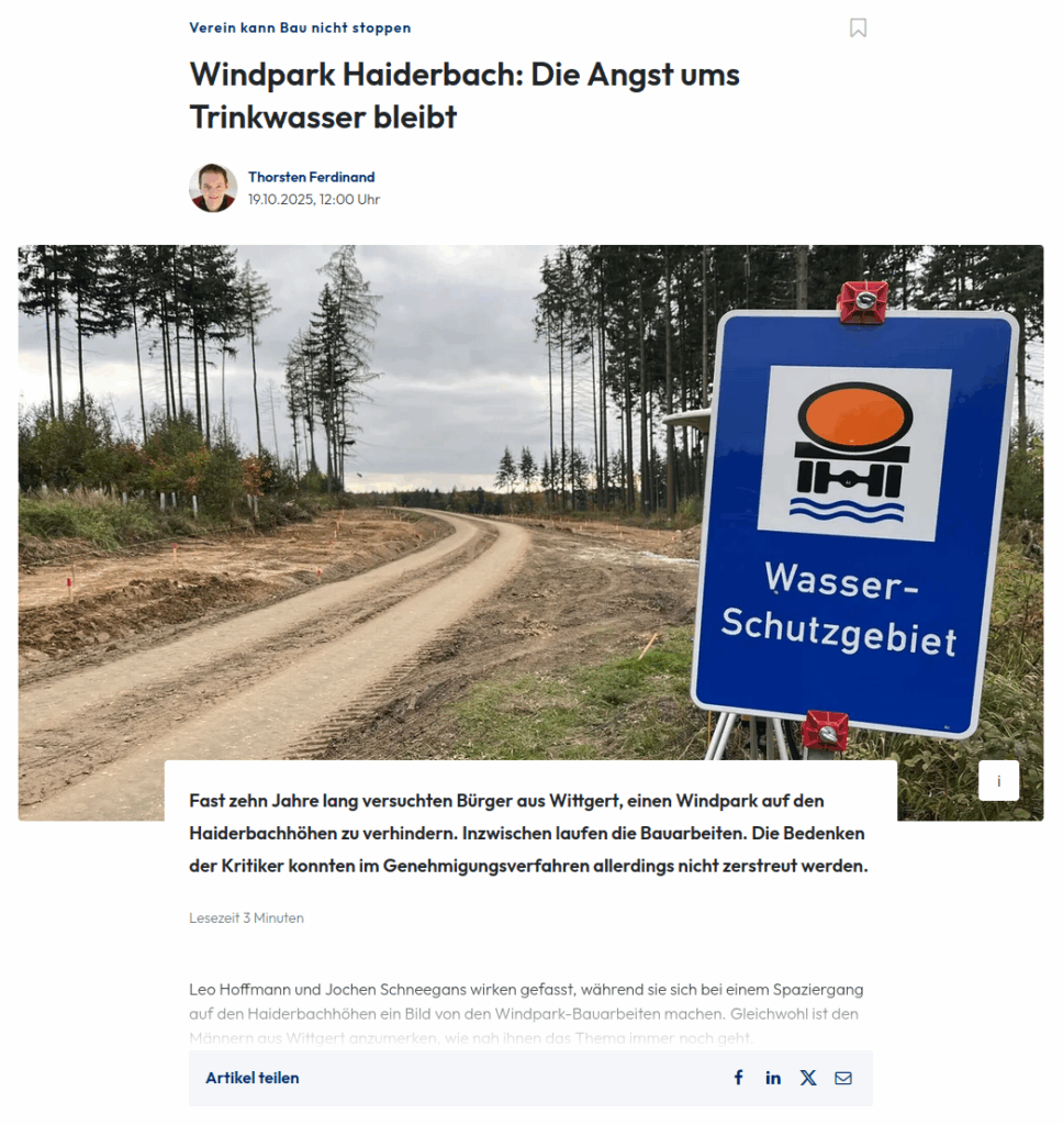 Nur wer naiv dem Weltrettungsnarrativ glaubt und entweder nicht rechnen kann oder die Zahlen nicht kennt, glaubt noch immer, dass wir hier irgendeinen „Beitrag“ leisten würden. Strom aus Windenergie wird landesweit bereits teuer genug erkauft, schließlich wird diese Technologie nun seit rund 30 Jahren subventioniert. Aber ohne Flächen wäre dieses Geschäftsmodell aus Mangel an Wirtschaftlichkeit bereits zum Erliegen kommen. In „grüner Transformation“ wandelt man rücklsichtlos nun Unwirtschaftliches auf unser aller Kosten (und auf Kosten der Natur, Artenvielfalt und der Trinkwasserqualität) um in Wirtschaftliches. Und so geht der Raubzug weiter…