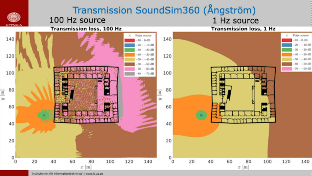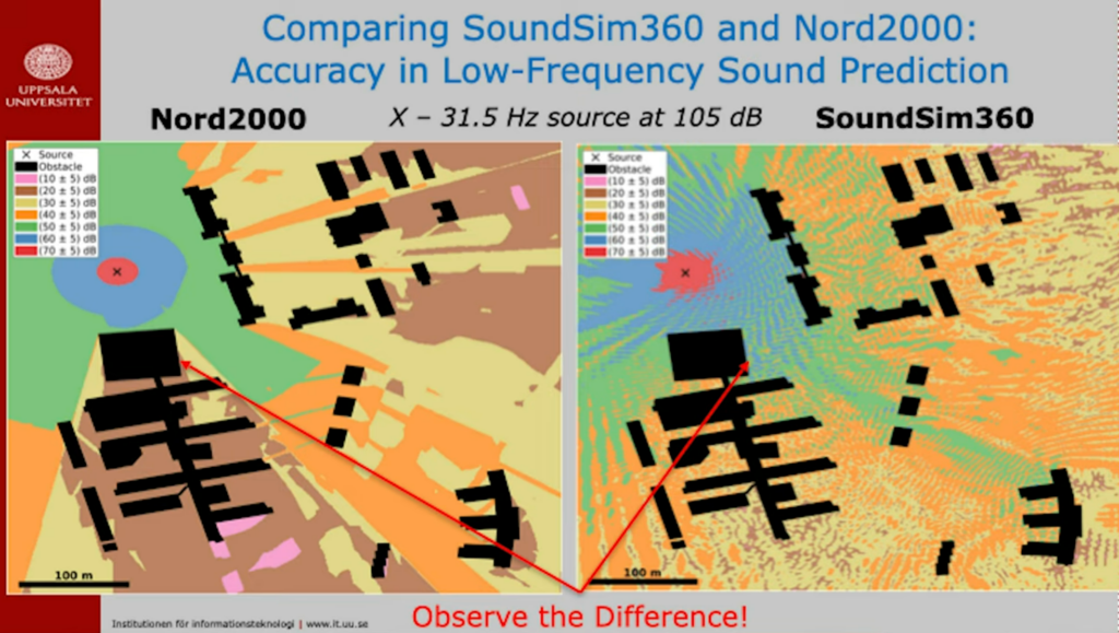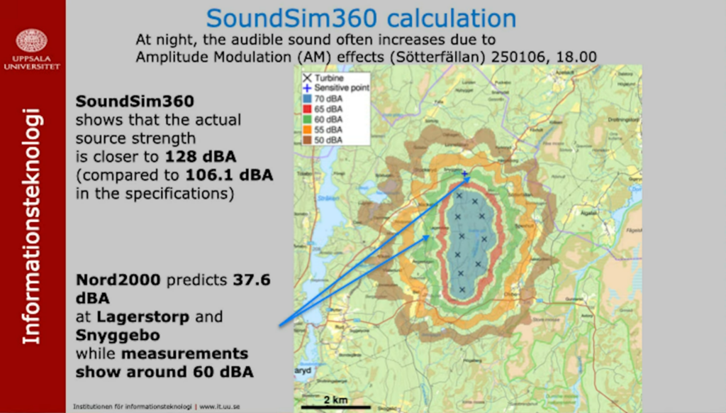 Der in Bild 3 gezeigte Vergleich von SoundSim360 und Nord2000 bezieht sich auf niederfrequenten Schall von 31,5 Hz. Diese Frequenz liegt noch über dem Infraschallbereich – dort wäre die Diskrepanz der Modelle noch größer. In Schweden werden allerdings nur Schallfrequenzen zwischen 31,5 – 200 Hz von externen Geräuschquellen betrachtet. Wie man im Modellvergleich leicht erkennen kann, unterschätzt das bislang als „Goldstandard“ anerkannte Modell Nord2000 die Immisionen bereits im niederfrequenten Bereich eklatant.