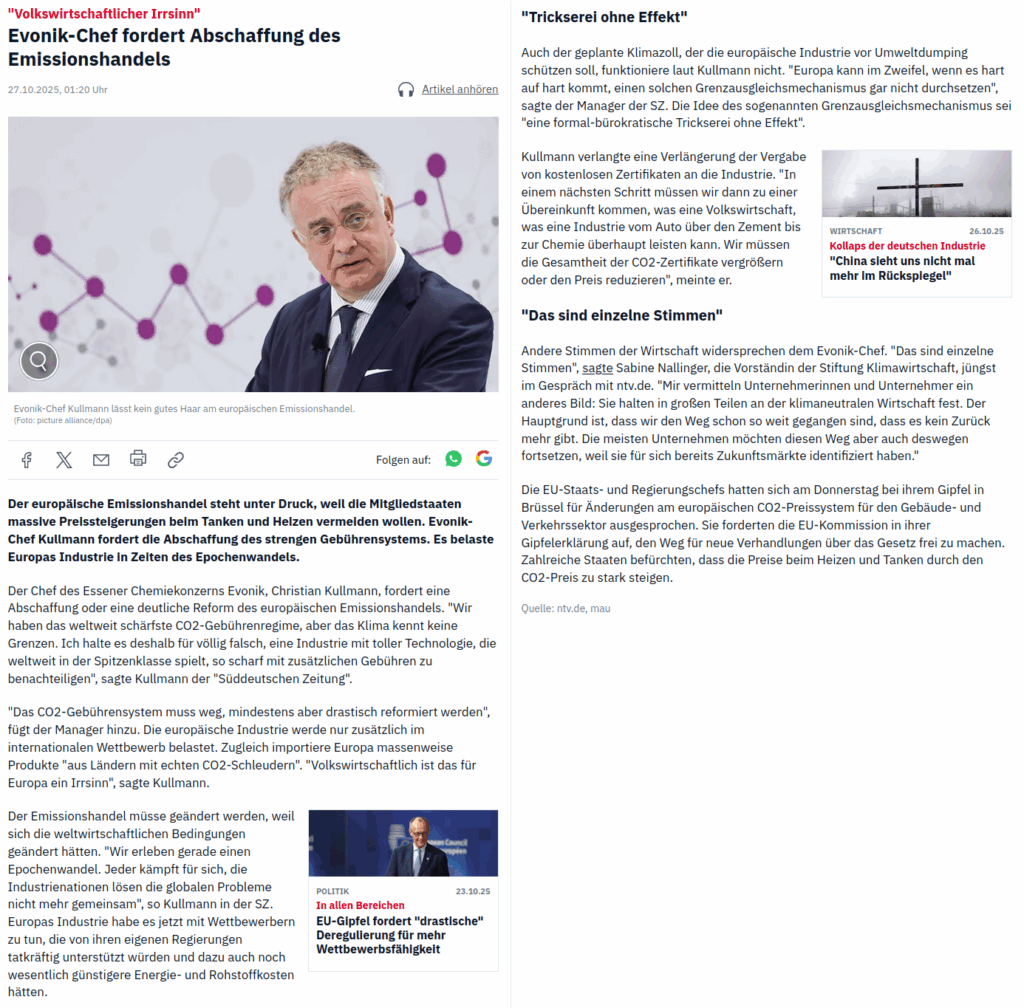 Die deutsche Wirtschaft kriselt und taumelt. Energieintensive Unternehmen wandern ab oder schließen Standorte. Immer mehr Konzernchefs trauen sich auch klarer die Gründe zu benennen und Änderungen einzufordern. Würde der Emissionshandel drastisch reduziert oder gar ganz wegfallen, würde diese Einnahmensäule ebenfalls wegbrechen.