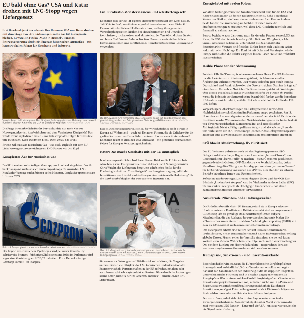 In einem gemeinsamen Brief an die EU-Staatschefs drohen nun die USA und Quatar mit einem Lieferstopp von LNG-Gas.