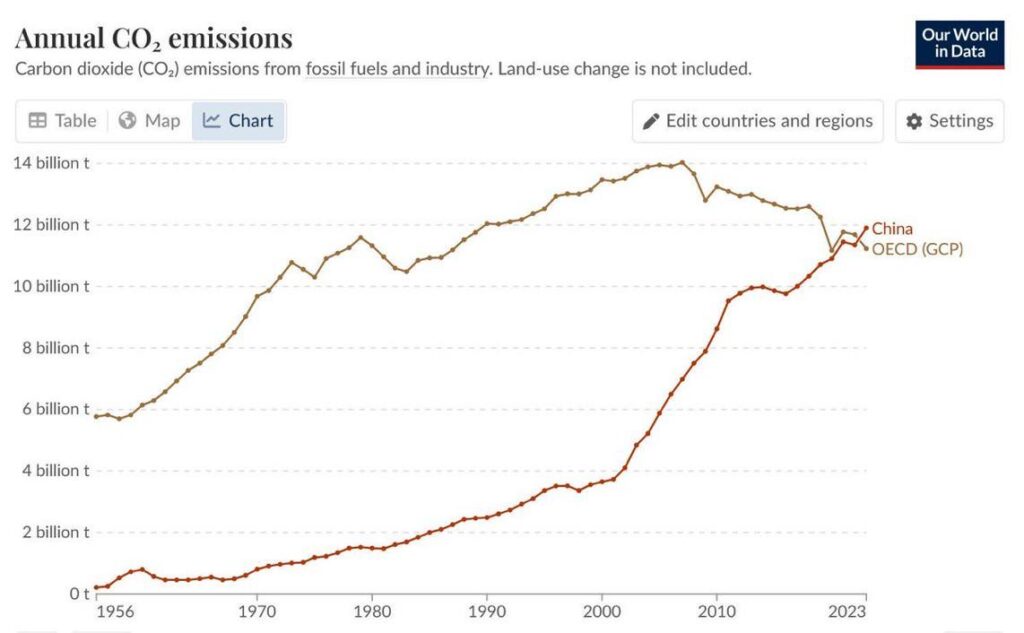 Den ganzen Irrsinn des Emissionshandels kann man aus dieser Grafik ablesen: Die Emissionen Chinas übersteigen nun die aller 38 OECD Staaten. Von „Klimaneutralität“ ist in China nix zu sehen. Und selbst wenn sich alle europäischen Staaten in den kollektiven industriellen CO2 Net Zero Selbstmord stürzen, ändert das absolut gar nix an den globalen Emissionen...