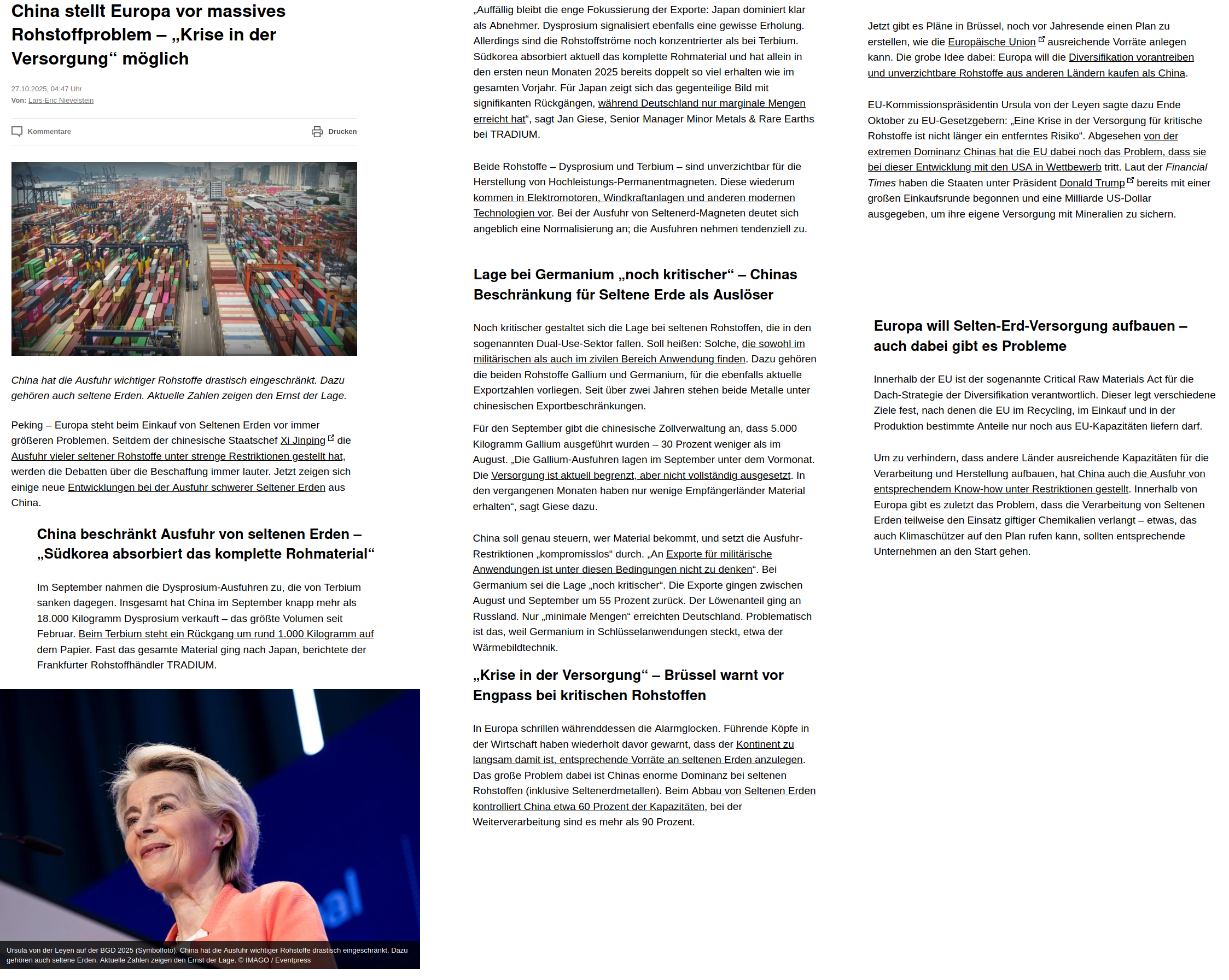 Um die Abhängigkeit von russischem Gas zu verringern, haben wir eine massive Abhängigkeit von China aufgebaut. Und diese wird von China gerade als Hebel gegen die europäische Wirtschaft eingesetzt: