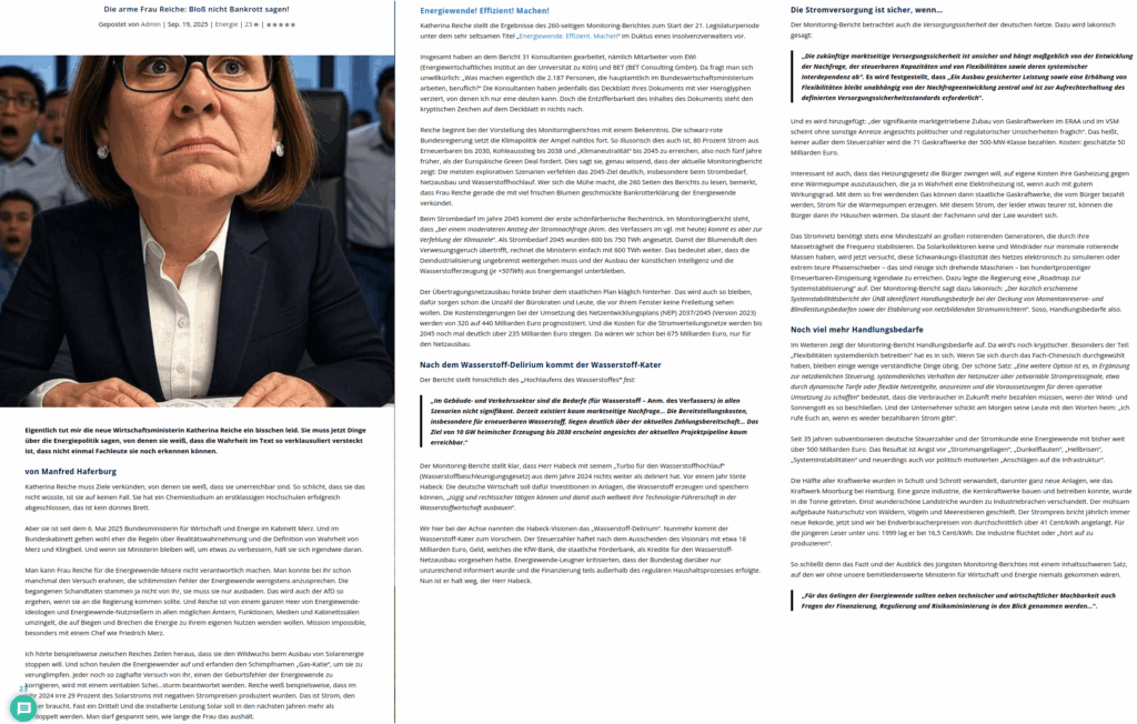 - Frau Reiche verkündet gerade die mit viel frischen Blumen geschmückte Bankrotterklärung der Energiewende