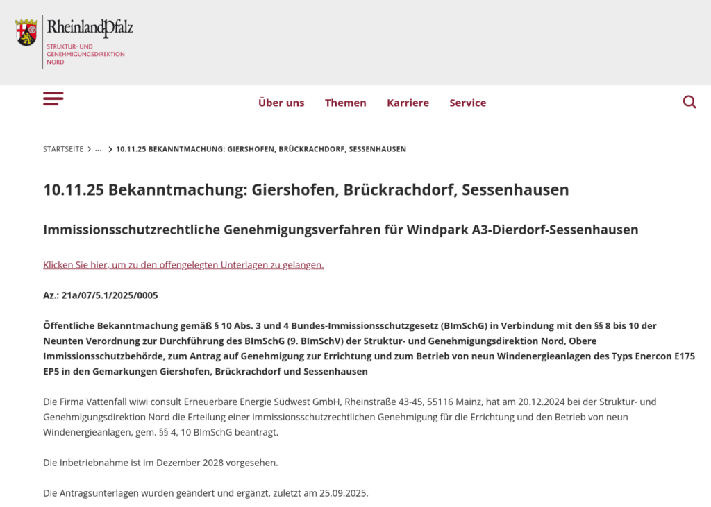 Seit dem 10.11.2025 wurden die Unterlagen zum Immissionsschutzrechtlichen Genehmigungsverfahren für den Windpark A3-Dierdorf-Sessenhausen von der SGD Nord offengelegt.