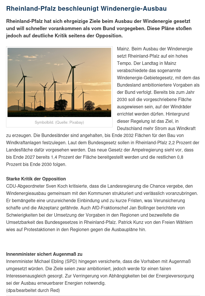 Rheinland-Pfalz verfolgt das Ziel, bis 2030 den eigenen Strombedarf bilanziell zu 100% aus erneuerbaren Energien zu decken, wobei jährlich 500 MW Windenergie und 500 MW Photovoltaik zugebaut werden sollen.